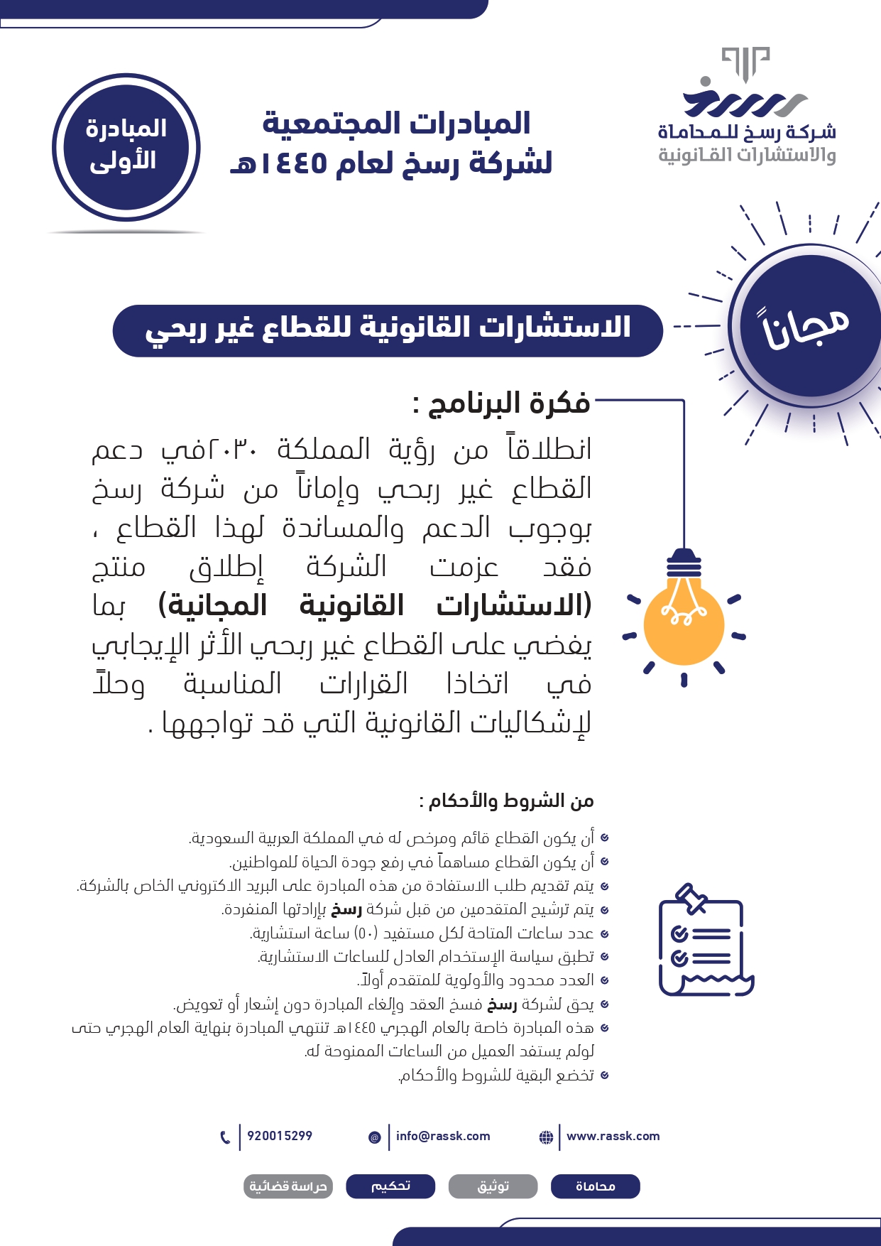 ﺷﺮﻛﺔ رﺳﺦ أﺷﺮﻗﺖ ﻣﻄﻠﻊ ﻋﺎم 2023م  ﻟﺘﺴﻬﻢ ﻓﻲ ﺗﻘﺪﻳﻢ اﻟﺨﺪﻣﺎت اﻟﻘﺎﻧﻮﻧﻴﺔ واﻟﺸﺮﻋﻴﺔ وﻓﻖ أﻋﻠﻰ ﻣﻌﺎﻳﻴﺮ اﻟﺠﻮدة، ﻟﻤﻮاﻛﺒﺔ   اﻟﺘﻄﻮر   اﻟﺘﺸﺮﻳﻌﻲ  اﻟﺬي ﺗﺸﻬﺪه اﻟﻤﻤﻠﻜﺔ اﻟﻌﺮﺑﻴﺔ اﻟﺴﻌﻮدﻳﺔ، ﺑﻔﺮﻳﻖ ﻋﻤﻞ ﻳﺘﻜﻮن ﻣﻦ ﻧﺨﺒﺔ ﻣﻦ أﻓﻀﻞ اﻟﻤﺤﺎﻣﻴﻦ اﻟﻤﻤﺎرﺳﻴﻦ واﻟﻤﺴﺘﺸﺎ رﻳﻦ اﻟﻘﺎﻧﻮﻧﻴﻴﻦ  واﻟﺸﺮﻋﻴﻴﻦ اﻟﻤﺘﻤﻴﺰﻳﻦ .